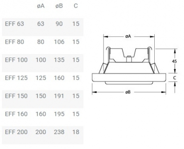EFF изготавливается из листовой стали и покрашен в белый цвет (RAL 9010-80). Существуют следующие диаметры: ø80, ø100, ø125, ø160 и ø200. Размер ø160 (EFF 160a) подходит как для воздуховодов диаметром 150, так и для воздуховодов диаметром 160.