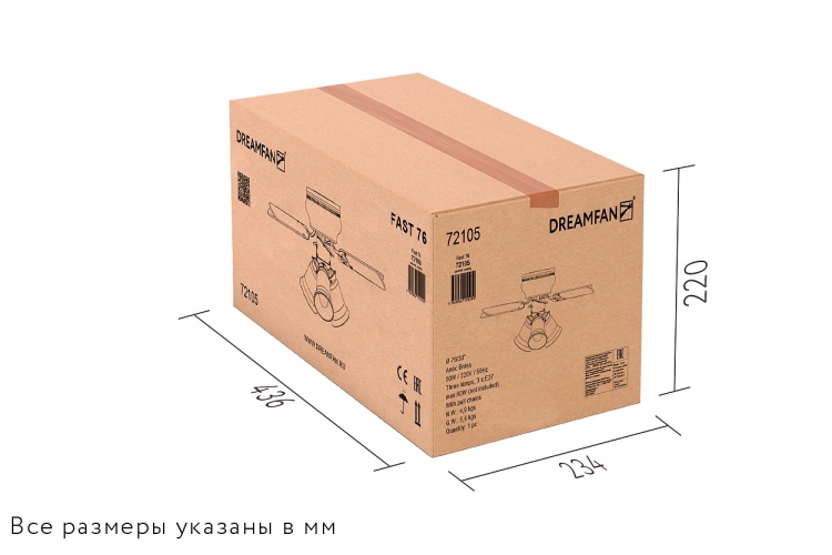 Чтобы не повредить люстру-вентилятор  Fast 76 во время перевозки, устройство частично разобрано и уложено в картонную коробку, уплотненную пенопластом. В поставляемый комплект входит: