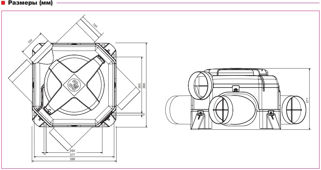 Вентилятор состоит из пластикового корпуса с четырьмя всасывающими патрубками и одним нагнетательным, все патрубки имеют диаметр 125 мм. В комплекте с вентилятором поставляются три заглушки, которыми можно закрыть всасывающие патрубки, если нет необходимости использовать все четыре вытяжных канала.