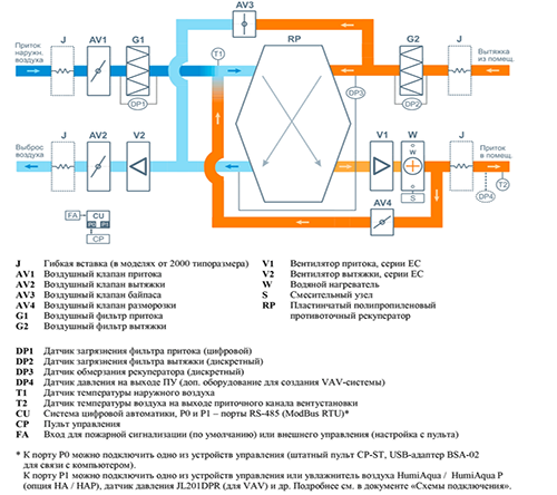 • - Система защиты от замерзания и система разморозки рекуператора.