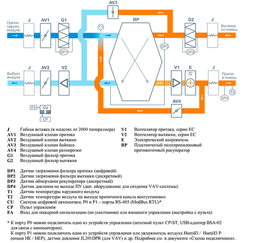 HEP – Управление увлажнителем с электрическим пред- и постнагревателем WEB – Удаленное управление вентустановкой через web-интерфейс CT – Поддержание температуры в помещении по доп. датчику температуры (каскадный регулятор) CC – Автоматическое переключение тепло/холод (датчик заказывается отдельно) DC – Выход "сухие контакты" для управления ККБ типа On/Off (несовместимо с PC) PC – Выход 0-10В для управления инверторным ККБ (несовместимо с DC)