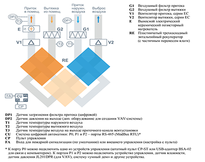 ОписаниеПриточно-вытяжная установка с трехкаскадным энтальпийным рекуператором (с переносом влаги) и электрическим нагревателем, комплектуется системой цифровой автоматики JetLogic с цветным сенсорным пультом управления и всеми необходимыми датчиками. Вентиляторы Ebmpapst серии EC (произведены в Германии).Внимание: воздушные клапаны с приводом не входят в комплект и могут поставляться опционально; относительная влажность вытяжного воздуха в холодный период года не должна превышать 40%.