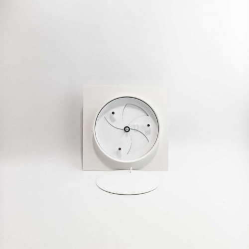 Так же диффузор состоит из металлической заслонкой, которой можно регулировать поток воздуха, либо полностью перекрыть его. К заслонке с помощью магнитов крепится декоративная круглая панелька, которую можно покрасить в цвет потолка. Так же по ободку диффузора имеется молярная сетка, для надёжной фиксации шпаклёвки. Наши диффузоры оснащены москитной сеточкой, которая препятствует попаданию насекомых в помещение.