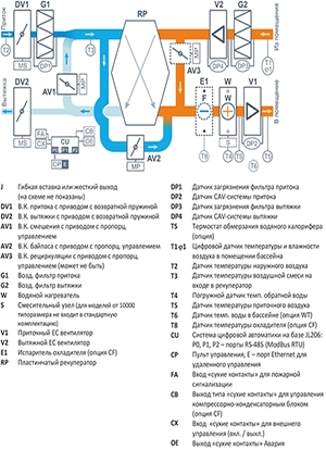 • Возможные опции WT температура воздуха по температуре воды PW дополнительный водяной калорифер CF дополнительный охладитель и управление ККБ DS диспетчеризация.