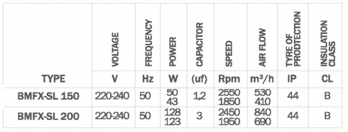 • Вентилятор изготовлен из пластика (модели BFMX 100 – BFMX 200), а у моделей BFMX 250 и BFMX 315 стальной корпус покрытый электростатической порошковой краской.