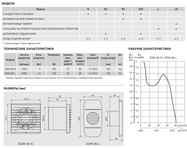 Вентиляторы EDM-80 изготавливаются из высококачественного пластика, комплектуются световым индикатором работы и однофазным электродвигателем (230В-50Гц), класс изоляции В, со встроенной термозащитой.